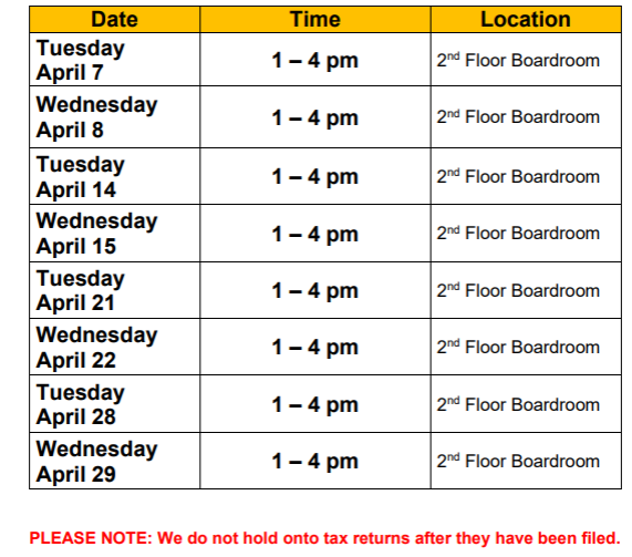 In March and April, we offer a free tax clinic for simple tax return filings for low-income, homeless, and/or marginally housed individuals. We are unable to complete tax returns involving self-employment.
